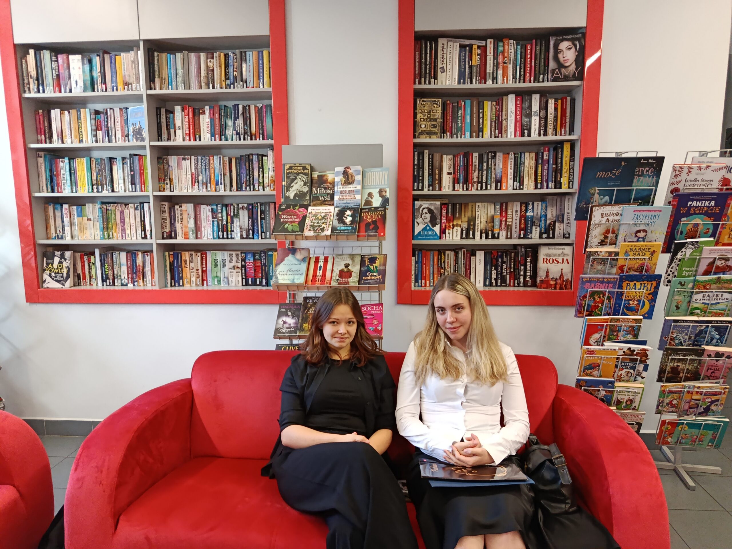 Dominika Walak z klasy 1d oraz Maja Kołaczyńska z klasy 3d, które w czwartek (06.11.2025.) w Bibliotece Pedagogicznej w Skierniewicach zaprezentowały swoje interpretacje wierszy Antoniego Słonimskiego: „Obrona księżyca” oraz „Inwokacja”.