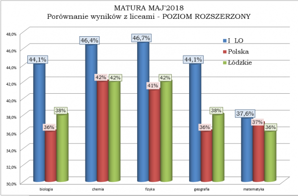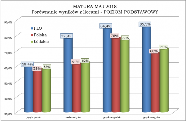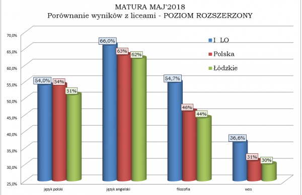Poniżej przedstawiamy graficzne porównanie wyników matur w naszej szkole Z LICEAMI w Polsce i województwie łódzkim: