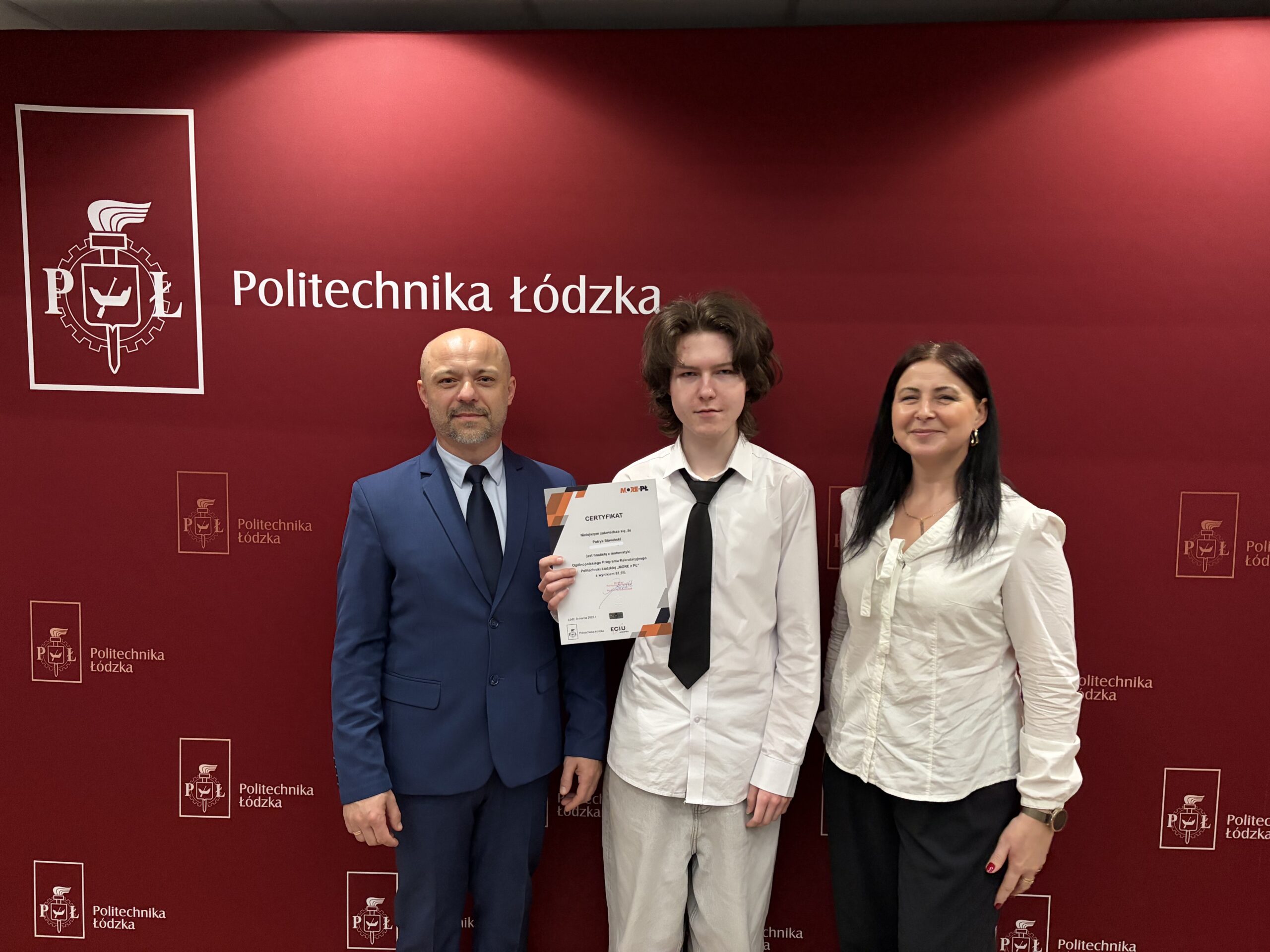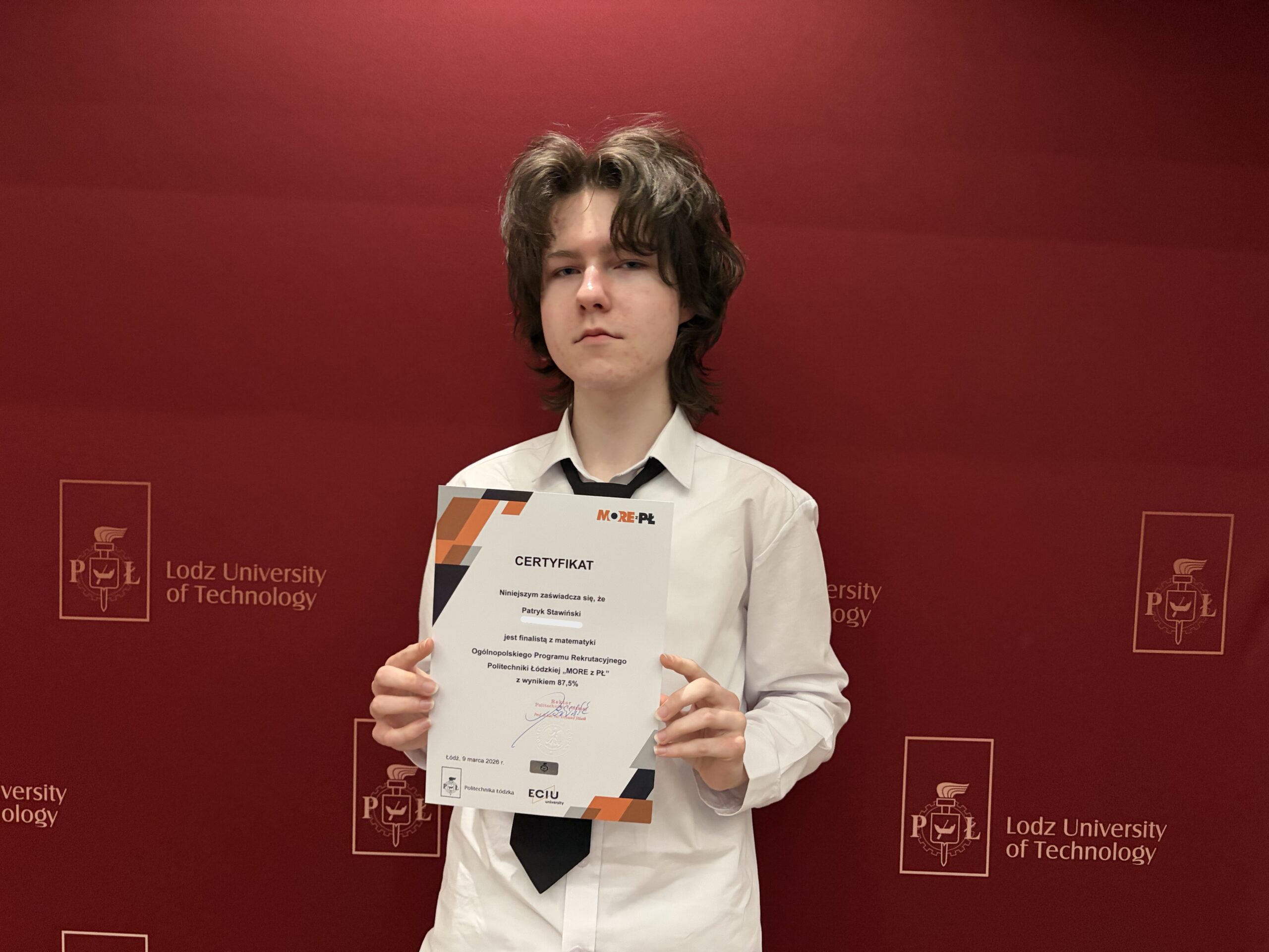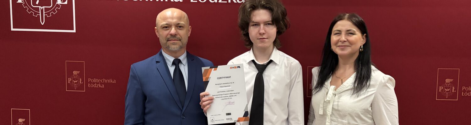 Patryk Stawiński, uczeń klasy 4e o profilu biologiczno-chemicznym, 24.03.2026 r. odebrał podczas uroczystej Gali na Politechnice Łódzkiej Certyfikat finalisty w Ogólnopolskim konkursie Programu Rekrutacyjnego „MORE z PŁ” , potwierdzony świetnie zdanym egzaminem.