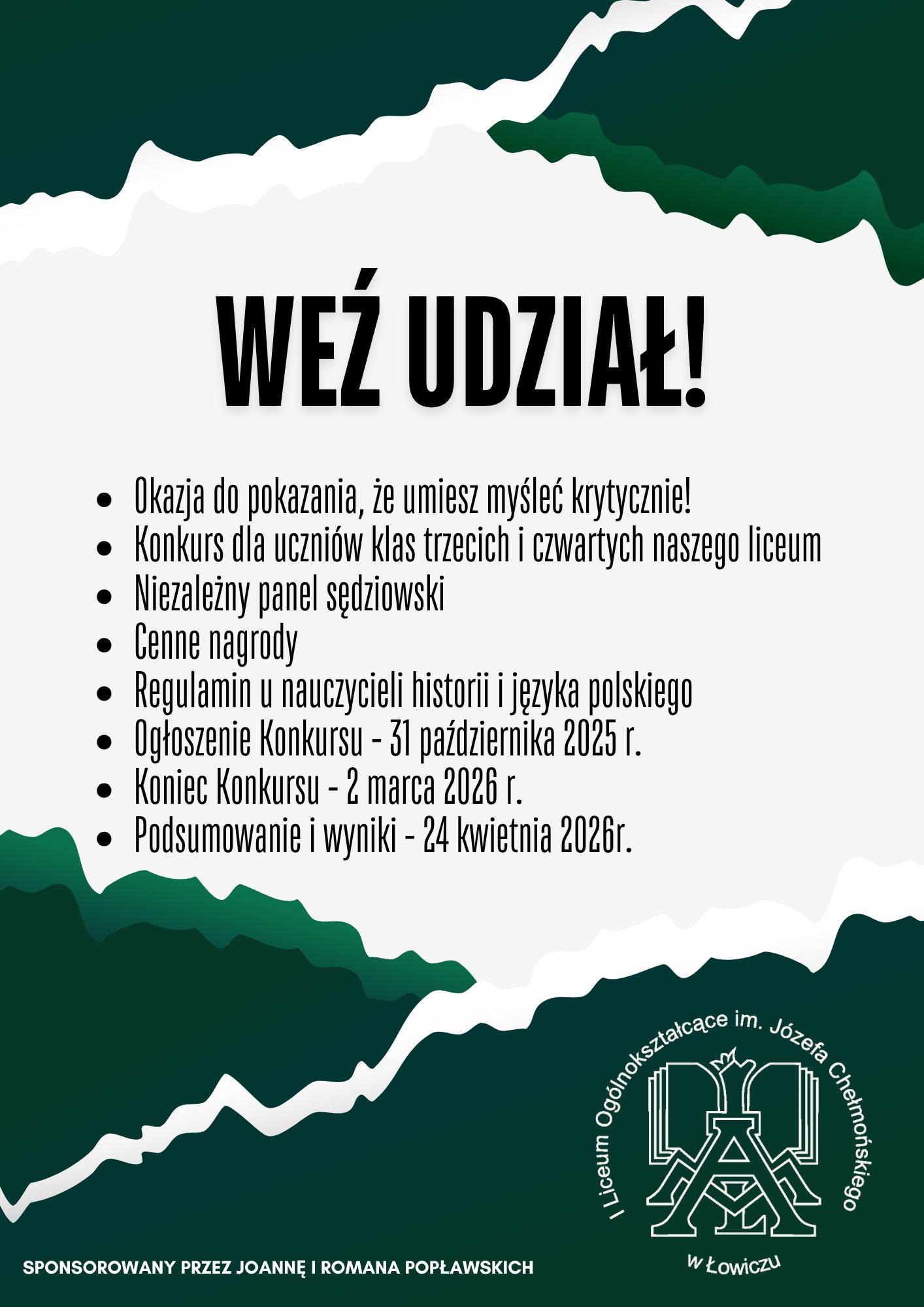 4. Ogłoszenie wyników Konkursu i wręczenie nagród nastąpi 24 kwietnia 2026 r. w I Liceum Ogólnokształcącym im. Józefa Chełmońskiego w Łowiczu.